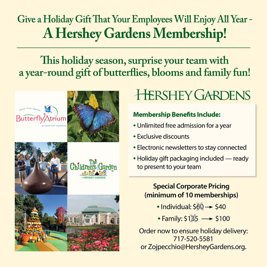- Unlimited admission to Hershey Gardens for one year, including the Milton & Catherine Hershey Conservatory and Butterfly Atrium